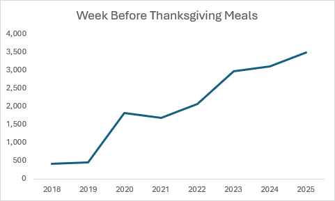 I’m grateful that I get to do this work with an incredible group of people that are the paid staff of The River. Each day I get to see them display our core values of respect, compassion, community, caring and generosity. We’ve had three record-breaking “events” recently: most households served in a day (577), most meals served in a single day (1,340), and busiest week.